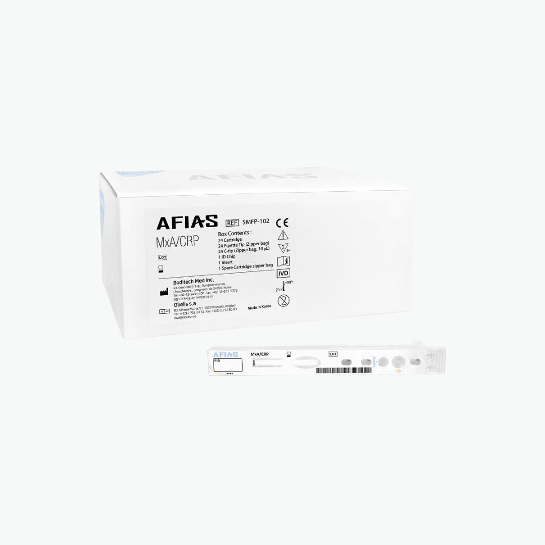AFIAS MxA/CRP is a fluorescence immunoassay (FIA) for the quantitative determination of Myxovirus resistance protein A (MxA) and C-Reactive Protein (CRP) in human whole blood. This test aids in identification of viral and/or bacterial infection in patients with clinical symptoms caused by infection.
